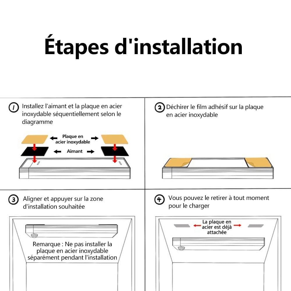 Installation facile : Grâce à leurs aimants puissants intégrés, ces lampes d'intérieur à détecteur de mouvement s'installent facilement, sans l'aide d'un électricien. Elles peuvent être fixées directement sur des surfaces en fer ou à l'aide des plaques métalliques autocollantes fournies. Elles sont également faciles à retirer et à remettre en place pour une recharge.