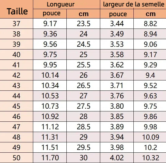 Veuillez vous référer à la longueur de la chaussure et à la largeur de la semelle intérieure pour choisir la bonne taille.